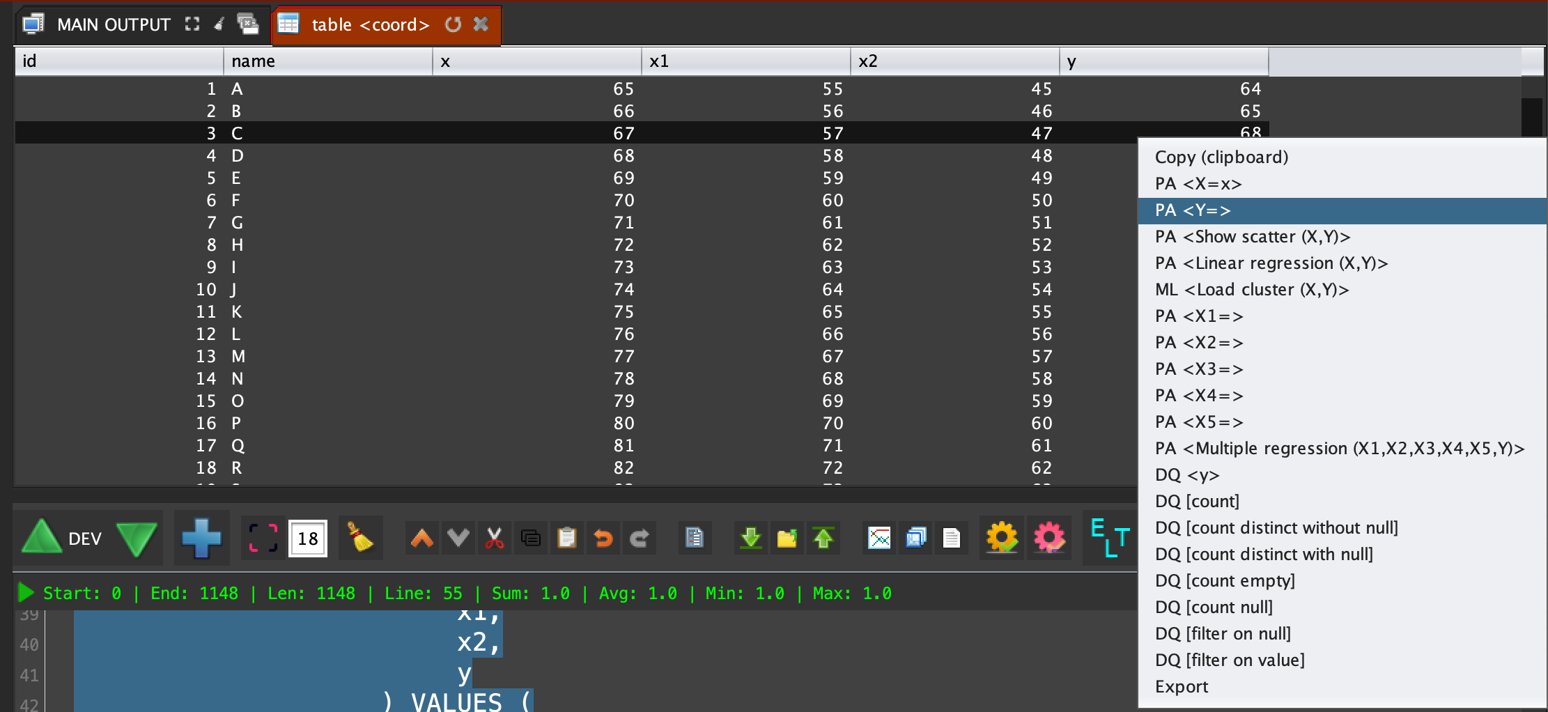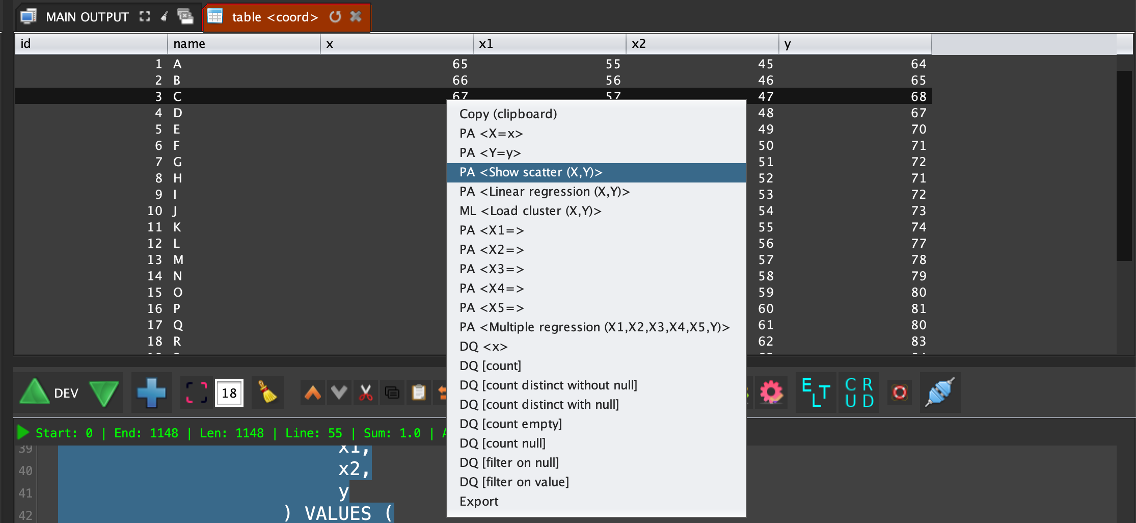 #This source code create a table and load data for the demonstration; #Connect to the database; sql connect "session1" {cm get "MENTDB";}; #Create the table; sql dml "session1" (concat "DROP TABLE IF EXISTS coord; CREATE TABLE coord ( id bigint NOT NULL AUTO_INCREMENT, name varchar(255) NOT NULL , x int NOT NULL, x1 int NOT NULL, x2 int NOT NULL, y int NOT NULL );"); #insert random data into the table; for (-> "[i]" 65) (<= [i] 90) (++ "[i]") { if (math random 2) { -> "[result]" (sql dml "session1" (concat "INSERT INTO public.coord ( name, x, x1, x2, y ) VALUES ( " (sql encode (string int_to_char [i])) " , " (sql encode [i]) " , " (sql encode (- [i] 10)) " , " (sql encode (- [i] 20)) " , " (sql encode (+ 1 [i])) " );" )); } { -> "[result]" (sql dml "session1" (concat "INSERT INTO public.coord ( name, x, x1, x2, y ) VALUES ( " (sql encode (string int_to_char [i])) " , " (sql encode [i]) " , " (sql encode (- [i] 10)) " , " (sql encode (- [i] 20)) " , " (sql encode (- [i] 1)) " );" )); }; }; #Disconnect from the database; sql disconnect "session1";