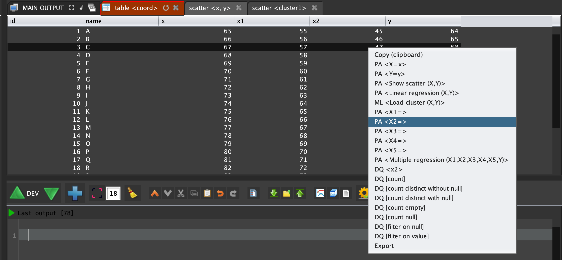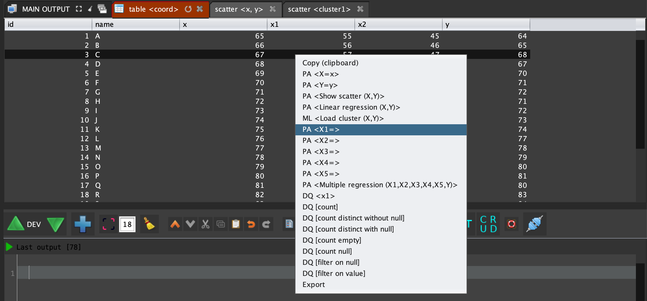 #This source code create a table and load data for the demonstration; #Connect to the database; sql connect "session1" {cm get "MENTDB";}; #Create the table; sql dml "session1" (concat "DROP TABLE IF EXISTS coord; CREATE TABLE coord ( id bigint NOT NULL AUTO_INCREMENT, name varchar(255) NOT NULL , x int NOT NULL, x1 int NOT NULL, x2 int NOT NULL, y int NOT NULL );"); #insert random data into the table; for (-> "[i]" 65) (<= [i] 90) (++ "[i]") { if (math random 2) { -> "[result]" (sql dml "session1" (concat "INSERT INTO public.coord ( name, x, x1, x2, y ) VALUES ( " (sql encode (string int_to_char [i])) " , " (sql encode [i]) " , " (sql encode (- [i] 10)) " , " (sql encode (- [i] 20)) " , " (sql encode (+ 1 [i])) " );" )); } { -> "[result]" (sql dml "session1" (concat "INSERT INTO public.coord ( name, x, x1, x2, y ) VALUES ( " (sql encode (string int_to_char [i])) " , " (sql encode [i]) " , " (sql encode (- [i] 10)) " , " (sql encode (- [i] 20)) " , " (sql encode (- [i] 1)) " );" )); }; }; #Disconnect from the database; sql disconnect "session1";