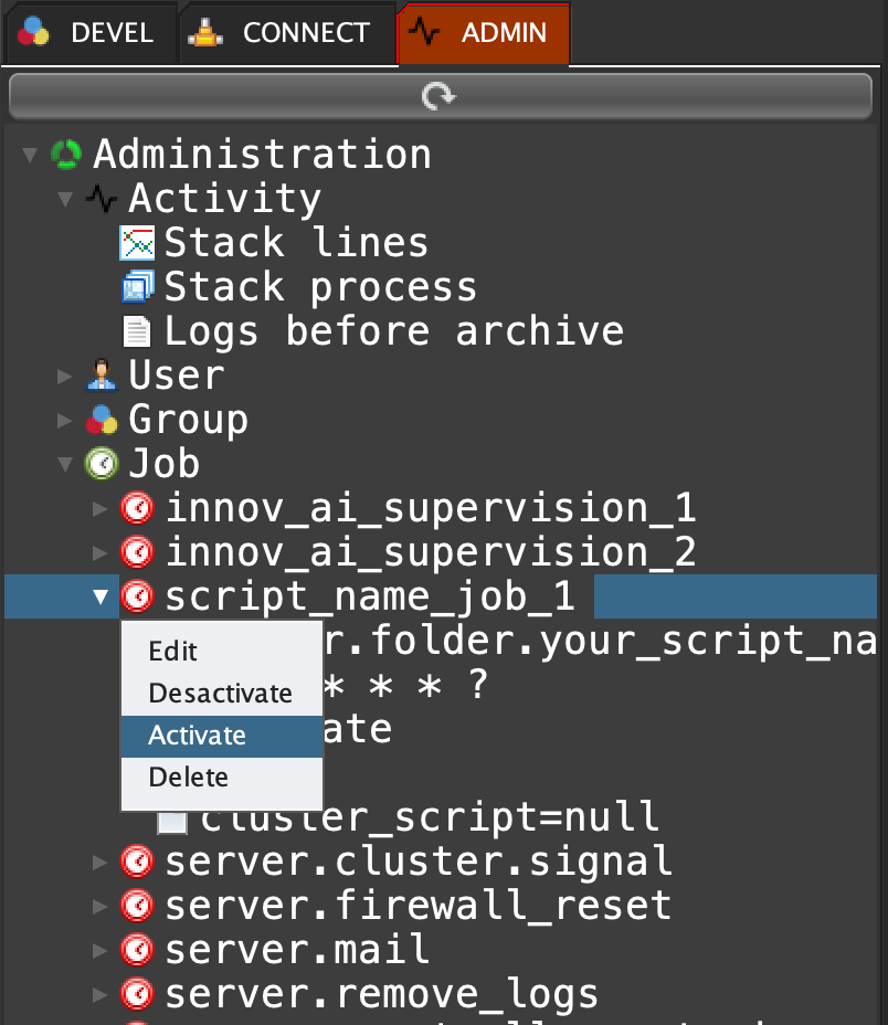 Click on 'ADMIN' tab, open 'Job', right click on the job key 'script_name_job_1' and select 'Activate'