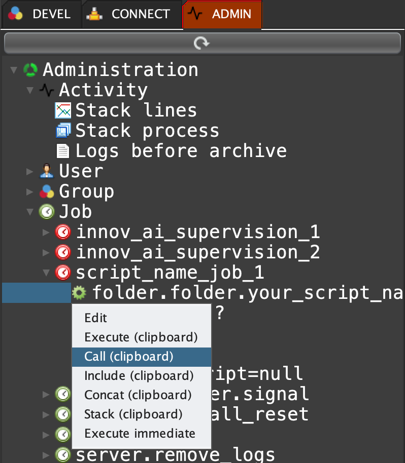 Click on 'ADMIN' tab, open 'Job', open the job 'script_name_job_1', right click on the script 'folder.folder.your_script_name.exe', and select 'Call (clipboard)'