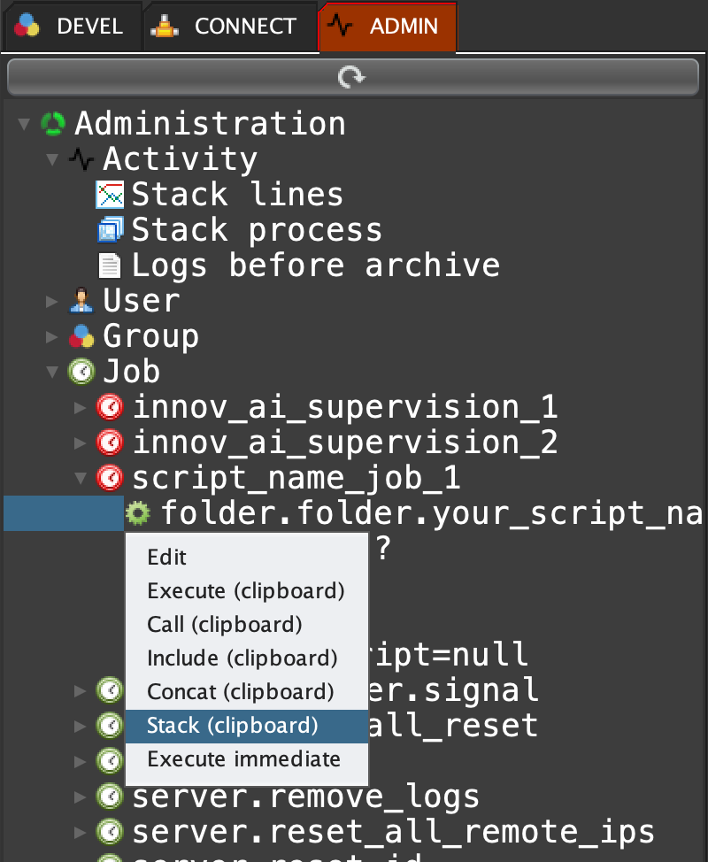 Click on 'ADMIN' tab, open 'Job', open the job 'script_name_job_1', right click on the script 'folder.folder.your_script_name.exe', and select 'Stack (clipboard)'
