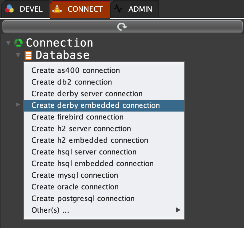 Click on 'CONNECT' tab, right click on 'Database' and select 'Create derby embedded connection'