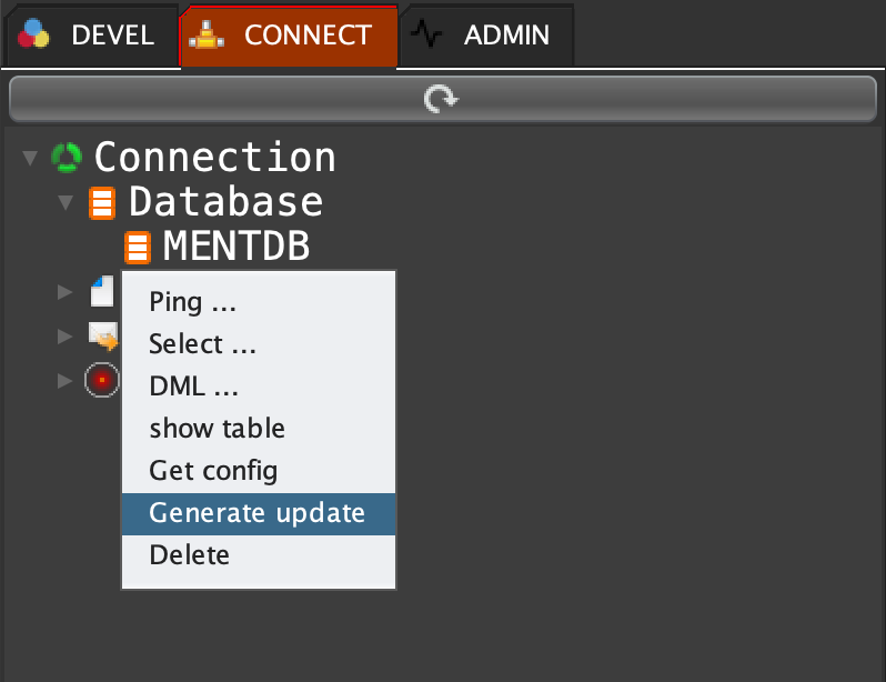 Click on 'CONNECT' tab, open 'Database', right click on 'MENTDB' and select 'Generate update'