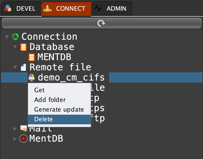 Click on 'CONNECT' tab, open 'Remote file', right click on 'demo_cm_cifs' and select 'Delete'
