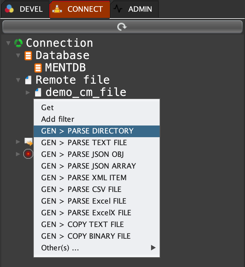 Click on 'CONNECT' tab, open 'Remote file', right click on 'demo_cm_file' and select 'GEN > PARSE DIRECTORY'