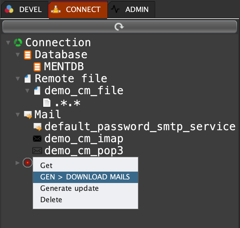 Click on 'CONNECT' tab, open 'Mail', right click on 'demo_cm_pop3' and select 'GEN > DOWNLOAD MAILS'