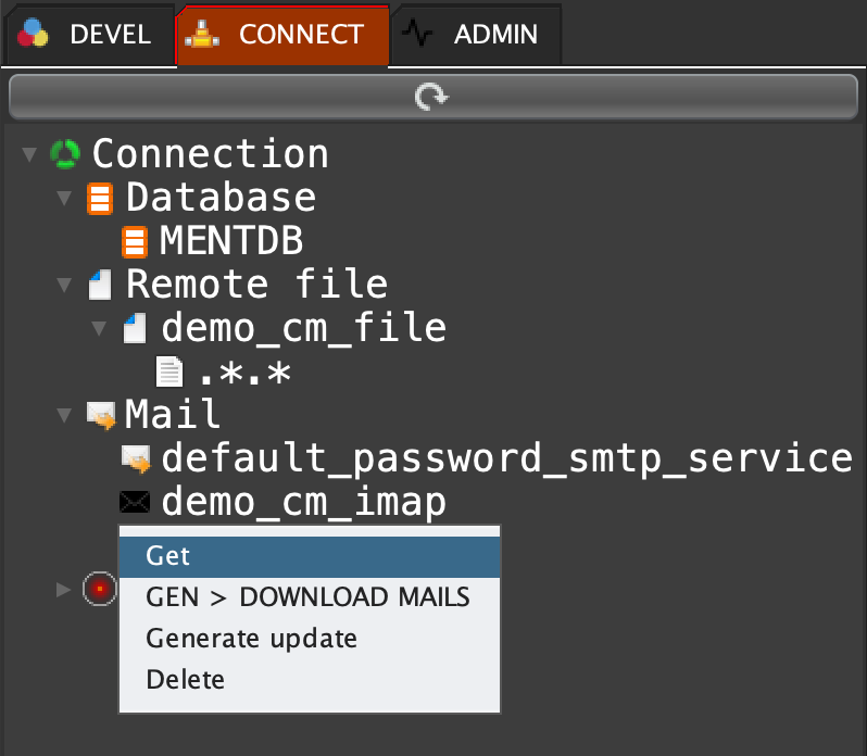 Click on 'CONNECT' tab, open 'Mail', right click on 'demo_cm_imap' and select 'Get'