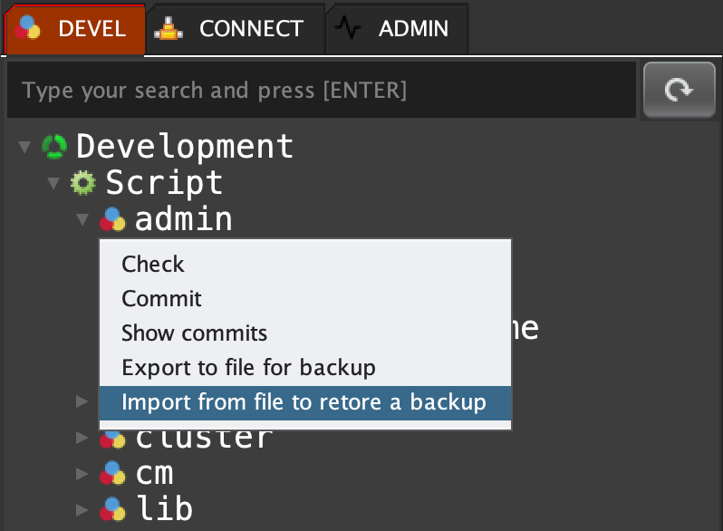 Click on 'DEVEL' tab, open 'Script', right click on 'admin' and select 'Import from file to restaure a backup'