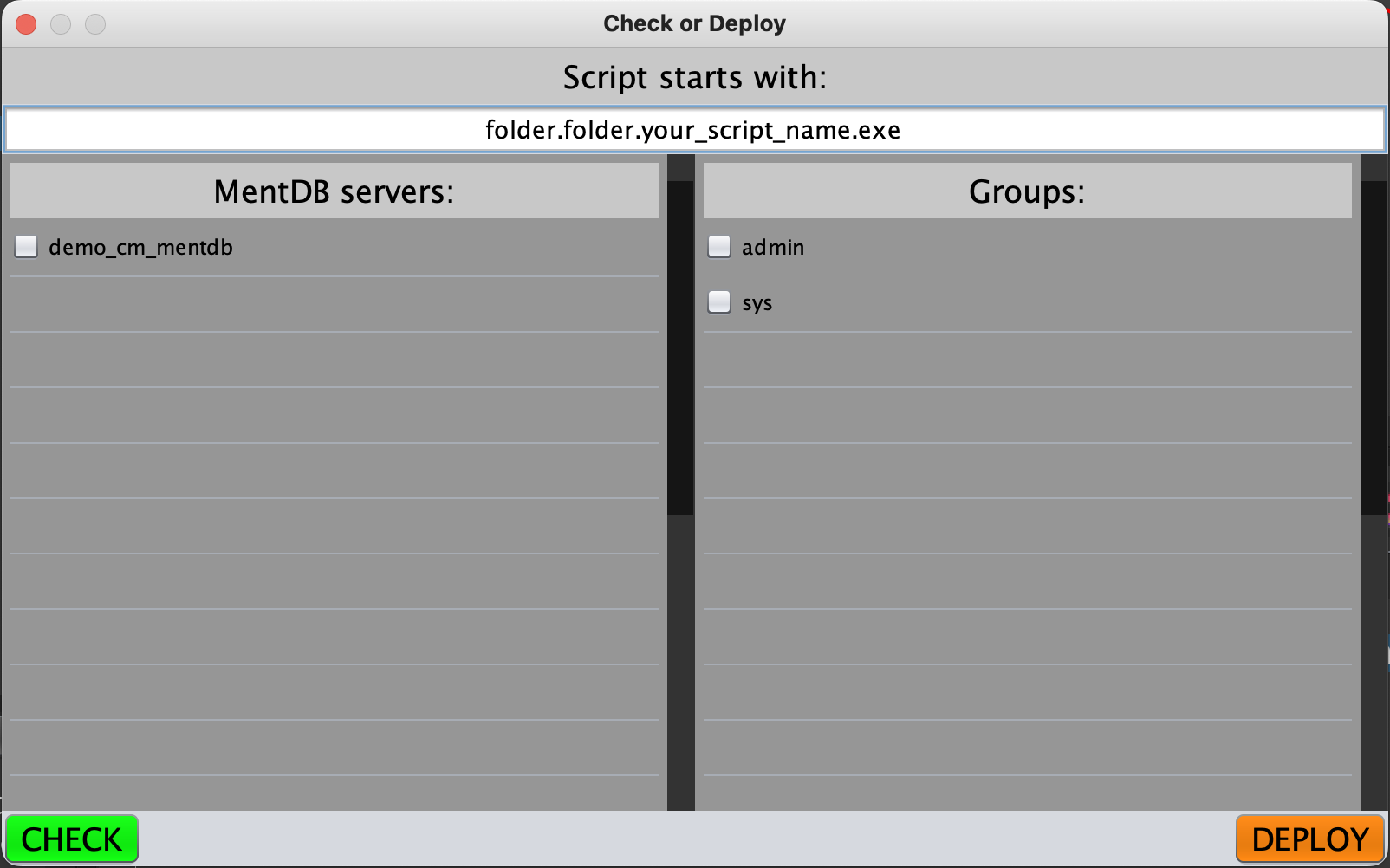 concat "demo_cm_mentdb:" [_n_] (execute "src.tools.deploy.exe" "[startsWith]" "folder.folder.your_script_name.exe" "[mentdbCmId]" "demo_cm_mentdb" "[groups]" "admin" "[check]" "1" ) " ################################################ "