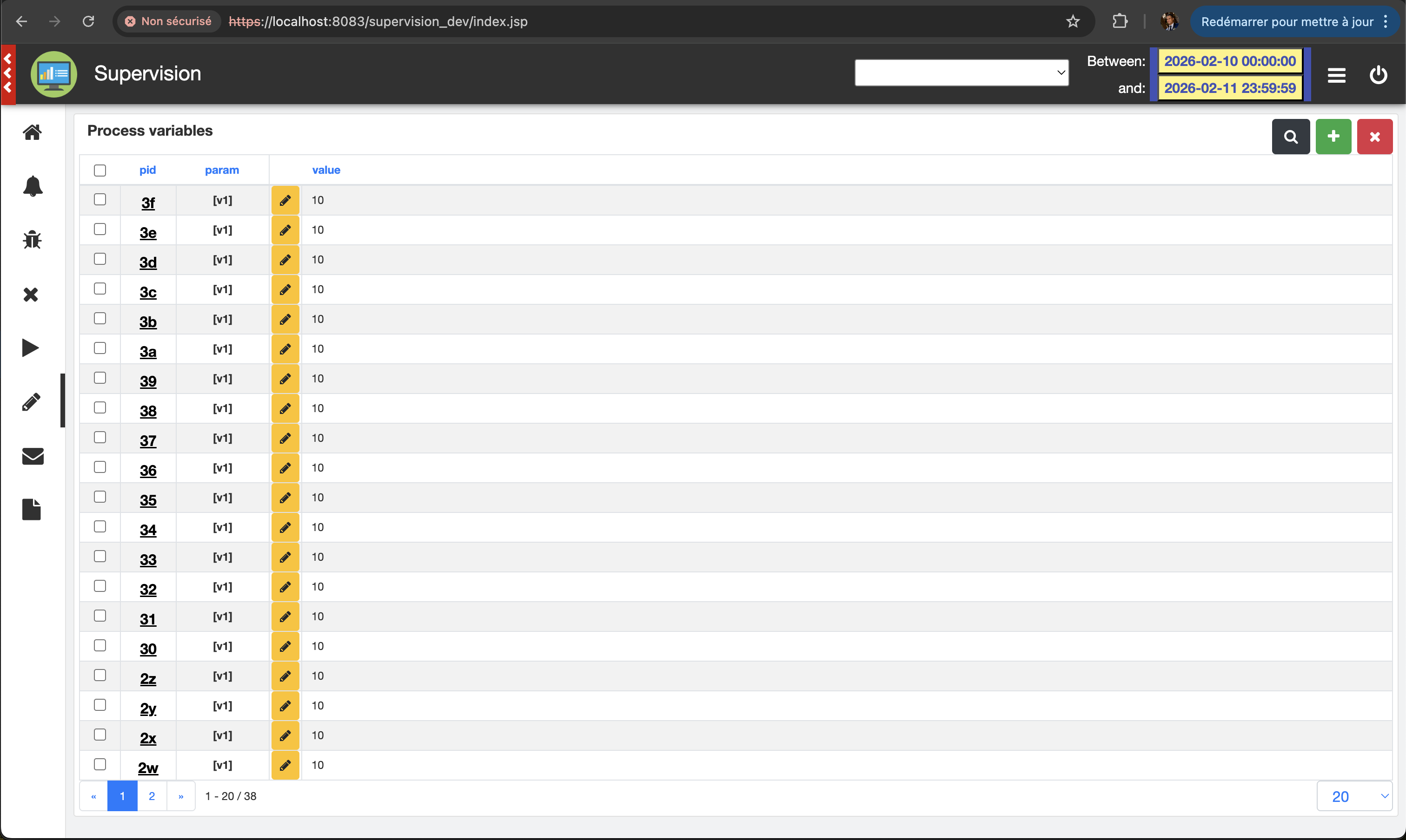 Connect to the application: https://localhost:8083/supervision_dev, and open the parameter process page (menu on the left)