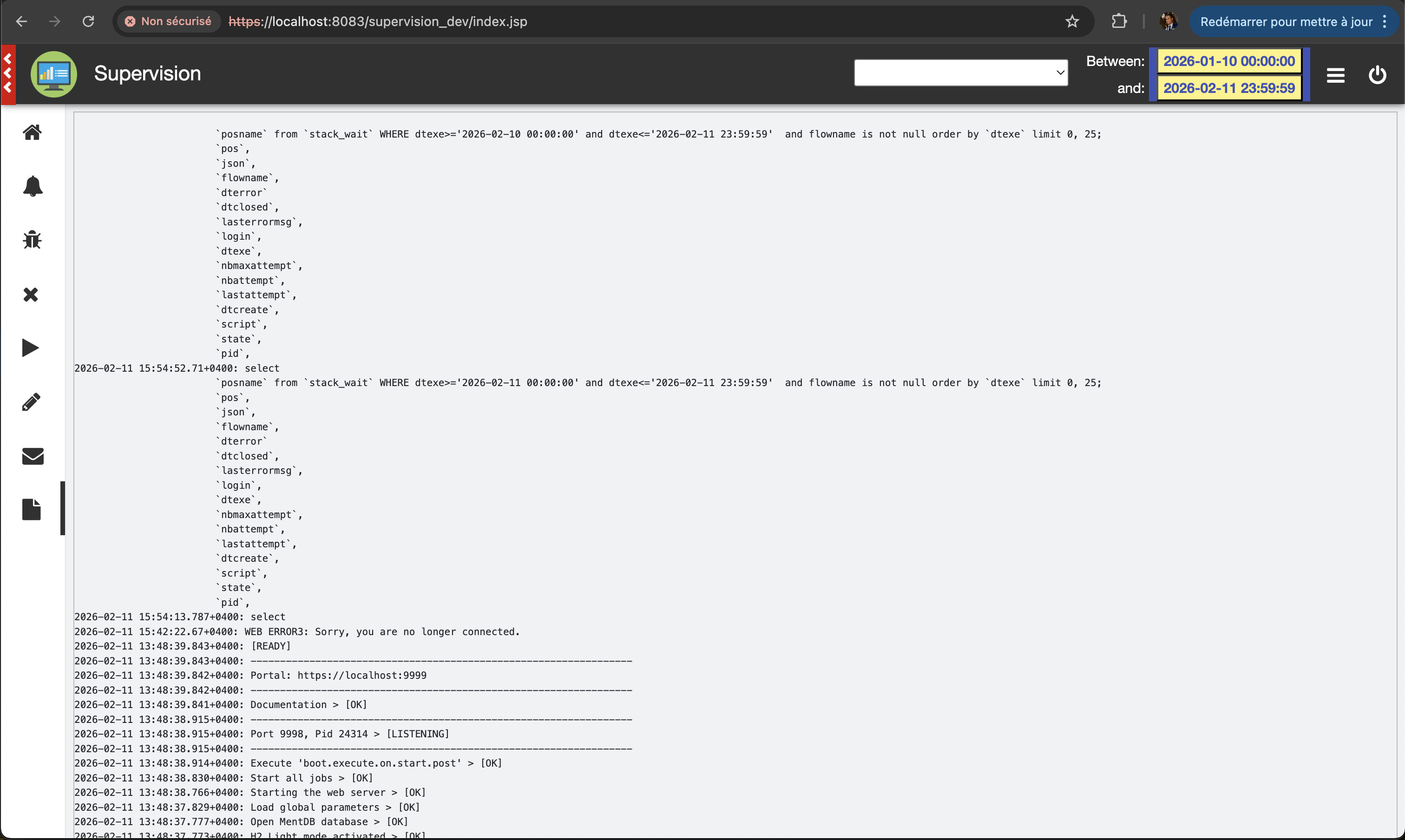 Connect to the application: https://localhost:8083/supervision_dev, and open the server log page (menu on the left)