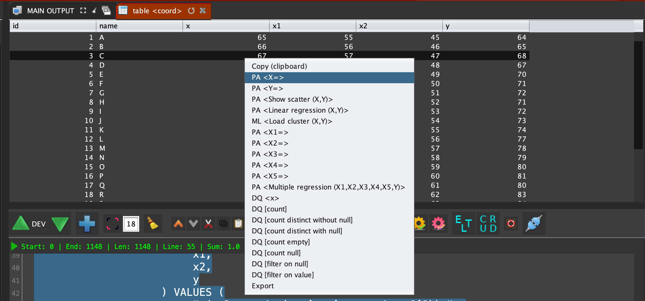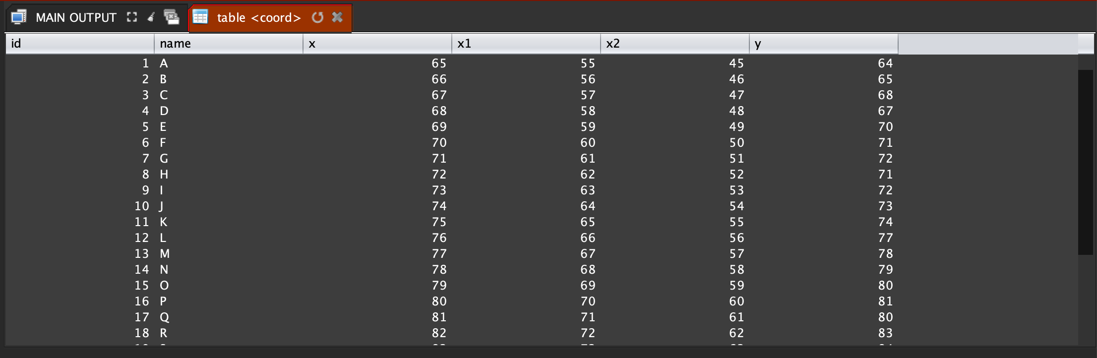 #This source code create a table and load data for the demonstration; #Connect to the database; sql connect "session1" {cm get "MENTDB";}; #Create the table; sql dml "session1" (concat "DROP TABLE IF EXISTS coord; CREATE TABLE coord ( id bigint NOT NULL AUTO_INCREMENT, name varchar(255) NOT NULL , x int NOT NULL, x1 int NOT NULL, x2 int NOT NULL, y int NOT NULL );"); #insert random data into the table; for (-> "[i]" 65) (<= [i] 90) (++ "[i]") { if (math random 2) { -> "[result]" (sql dml "session1" (concat "INSERT INTO public.coord ( name, x, x1, x2, y ) VALUES ( " (sql encode (string int_to_char [i])) " , " (sql encode [i]) " , " (sql encode (- [i] 10)) " , " (sql encode (- [i] 20)) " , " (sql encode (+ 1 [i])) " );" )); } { -> "[result]" (sql dml "session1" (concat "INSERT INTO public.coord ( name, x, x1, x2, y ) VALUES ( " (sql encode (string int_to_char [i])) " , " (sql encode [i]) " , " (sql encode (- [i] 10)) " , " (sql encode (- [i] 20)) " , " (sql encode (- [i] 1)) " );" )); }; }; #Disconnect from the database; sql disconnect "session1";