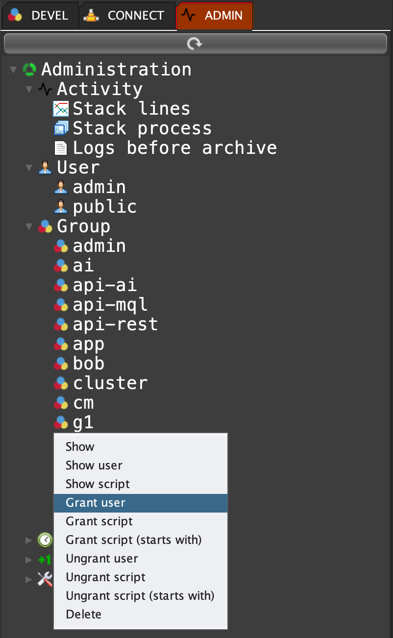 Click on 'ADMIN' tab, open 'Group', right click on the group 'g1' and select 'Grant user'