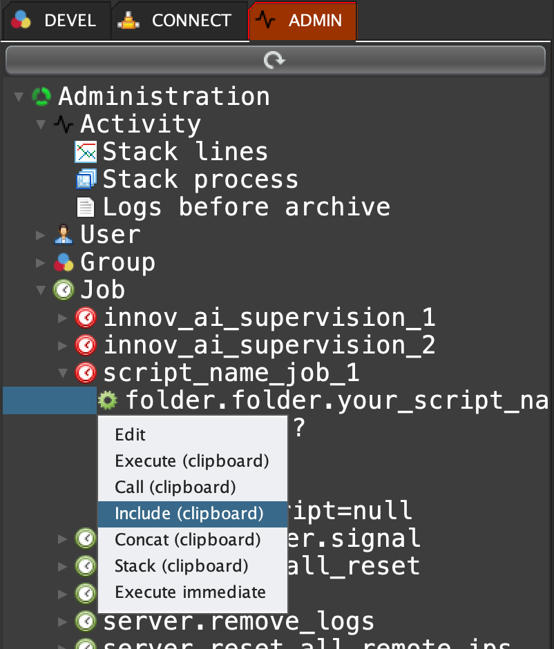 Click on 'ADMIN' tab, open 'Job', open the job 'script_name_job_1', right click on the script 'folder.folder.your_script_name.exe', and select 'Include (clipboard)'
