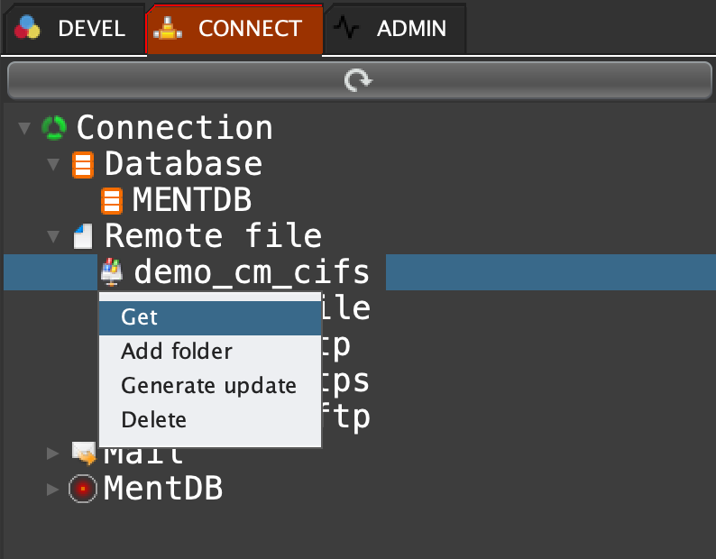 Click on 'CONNECT' tab, open 'Remote file', right click on 'demo_cm_cifs' and select 'Get'