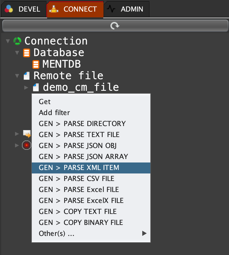 Click on 'CONNECT' tab, open 'Remote file', right click on 'demo_cm_file' and select 'GEN > PARSE XML ITEM'