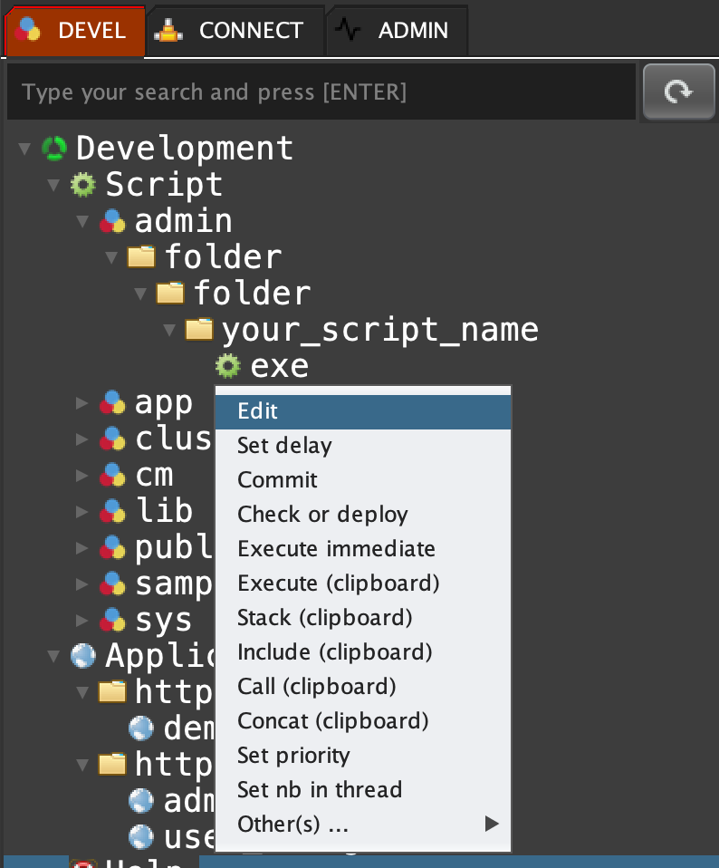 Click on 'DEVEL' tab, open 'Script', open 'admin', right click on 'folder.folder.your_script_name.exe' and select 'Edit'