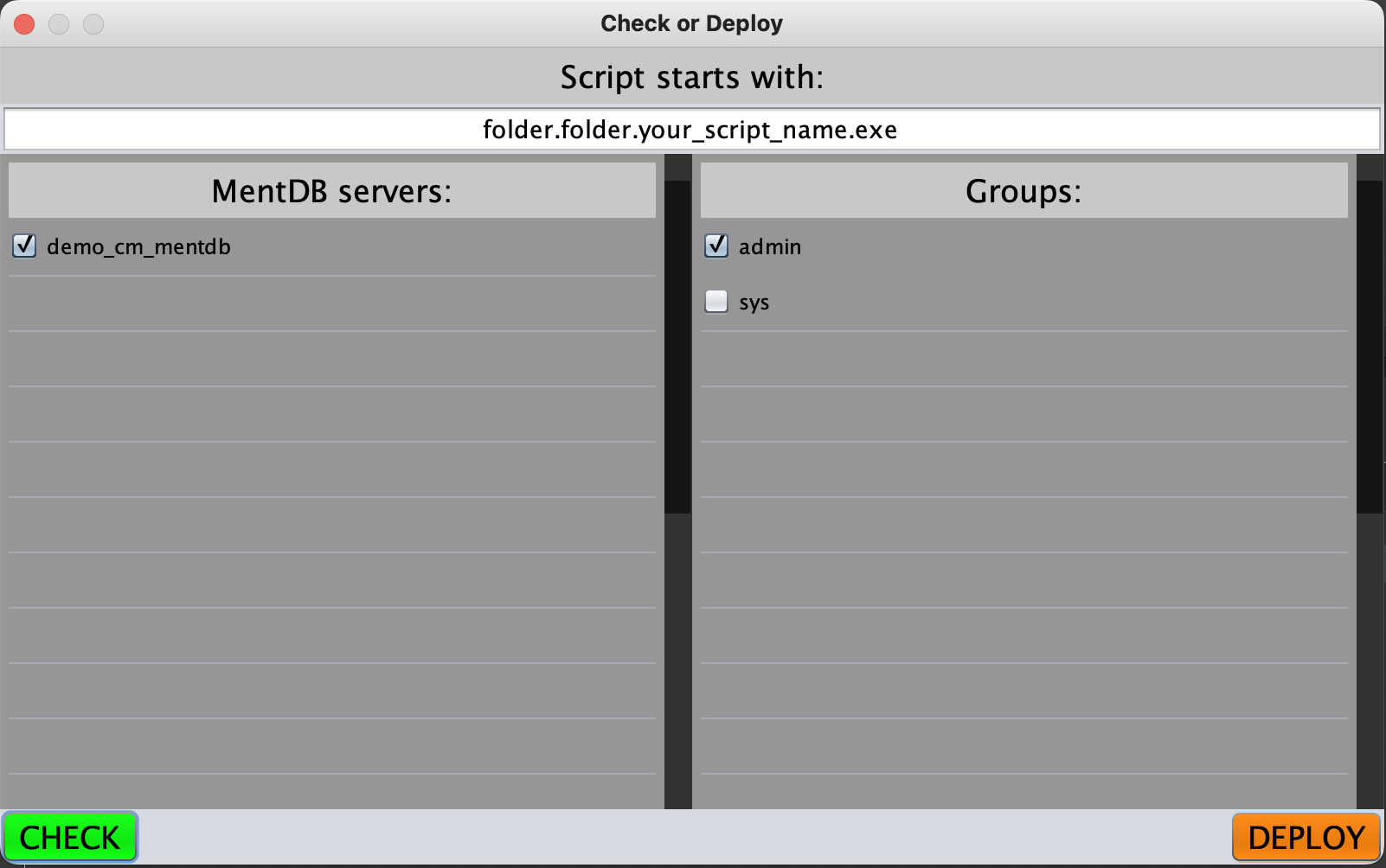 concat "demo_cm_mentdb:" [_n_] (execute "src.tools.deploy.exe" "[startsWith]" "folder.folder.your_script_name.exe" "[mentdbCmId]" "demo_cm_mentdb" "[groups]" "admin" "[check]" "1" ) " ################################################ "