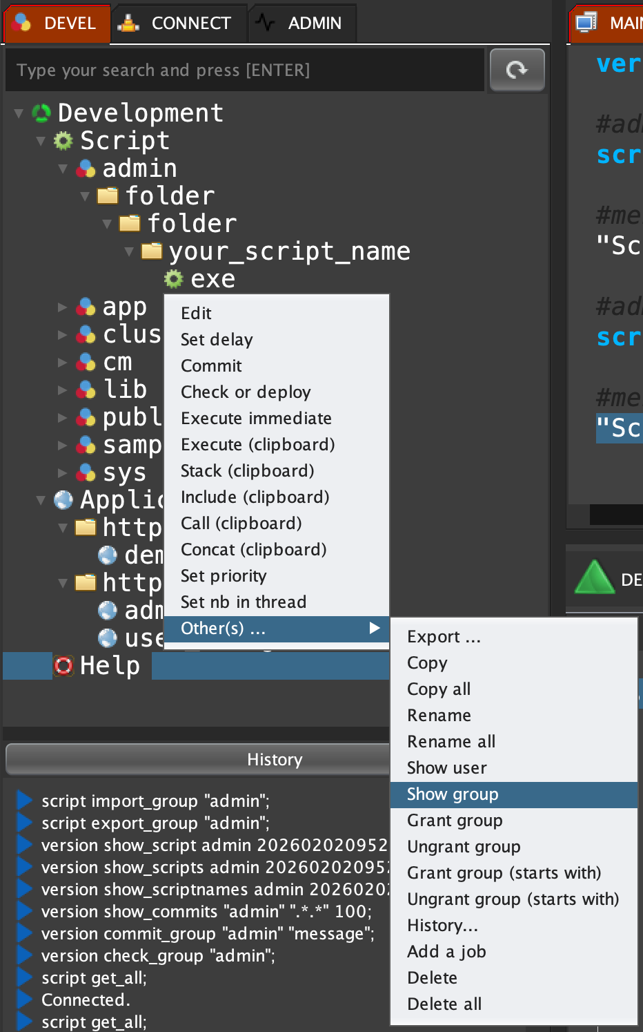 Click on 'DEVEL' tab, open 'Script', open 'admin', right click on 'folder.folder.your_script_name.exe' and select 'Show group'