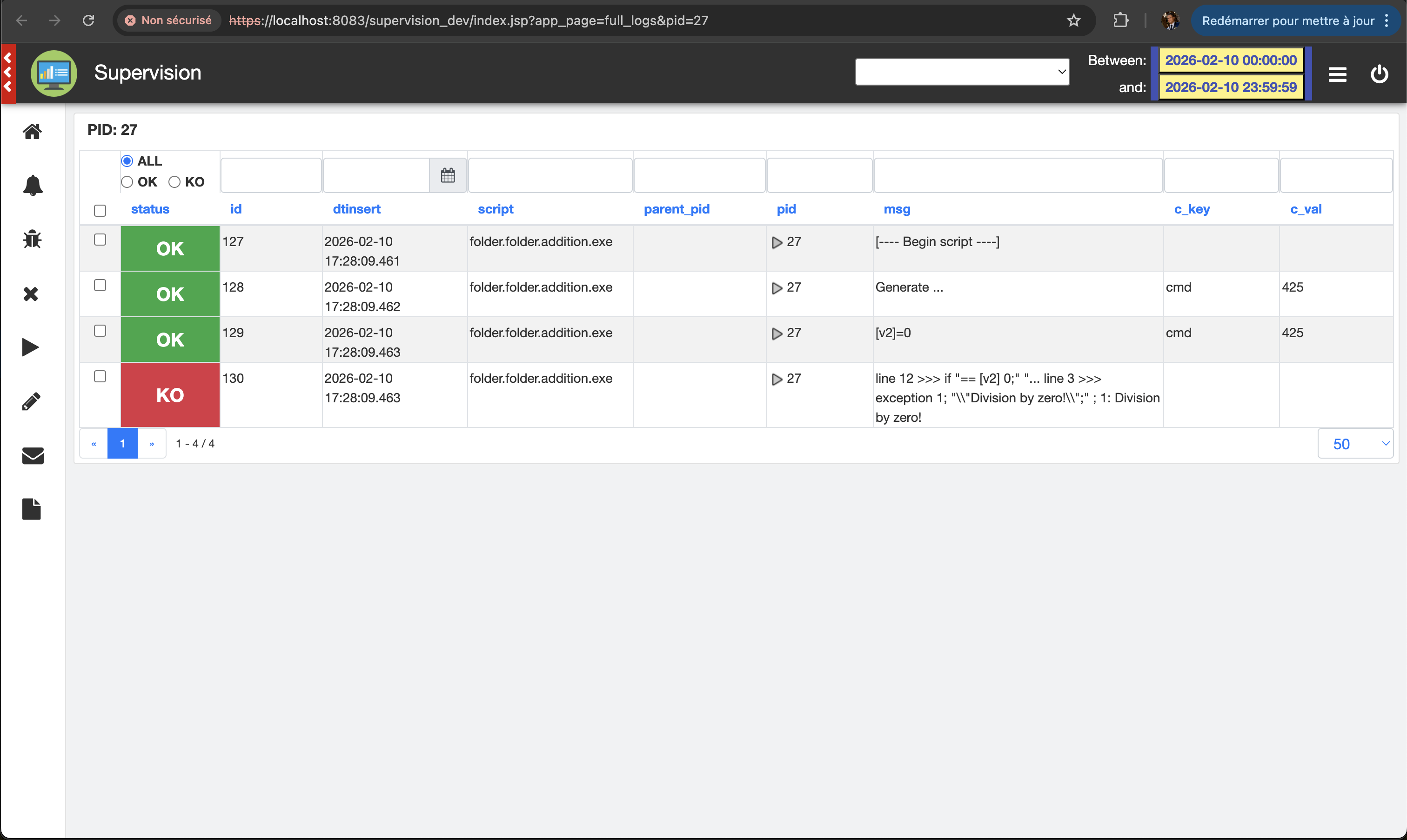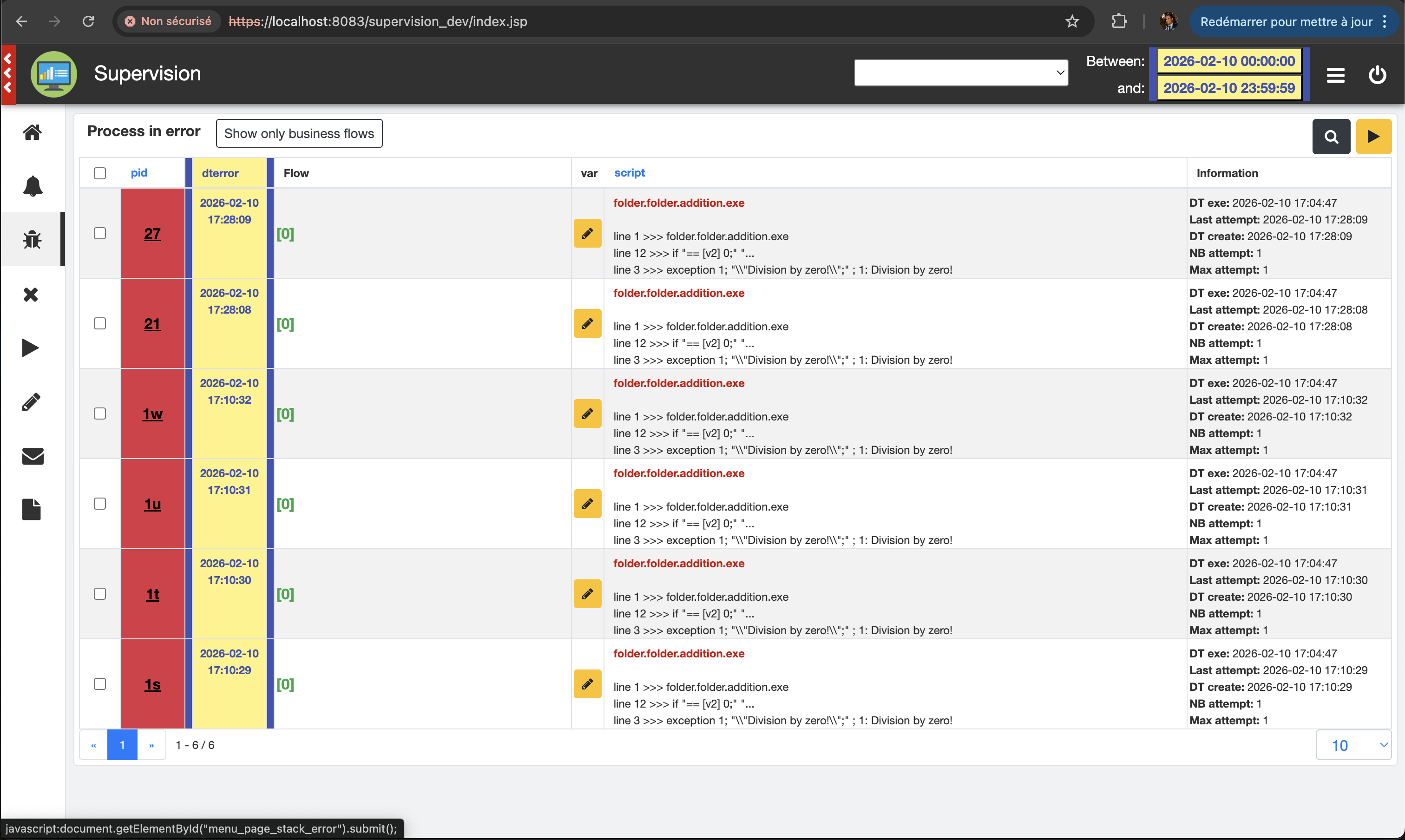 Connect to the application: https://localhost:8083/supervision_dev, and open the process in error page (menu on the left)