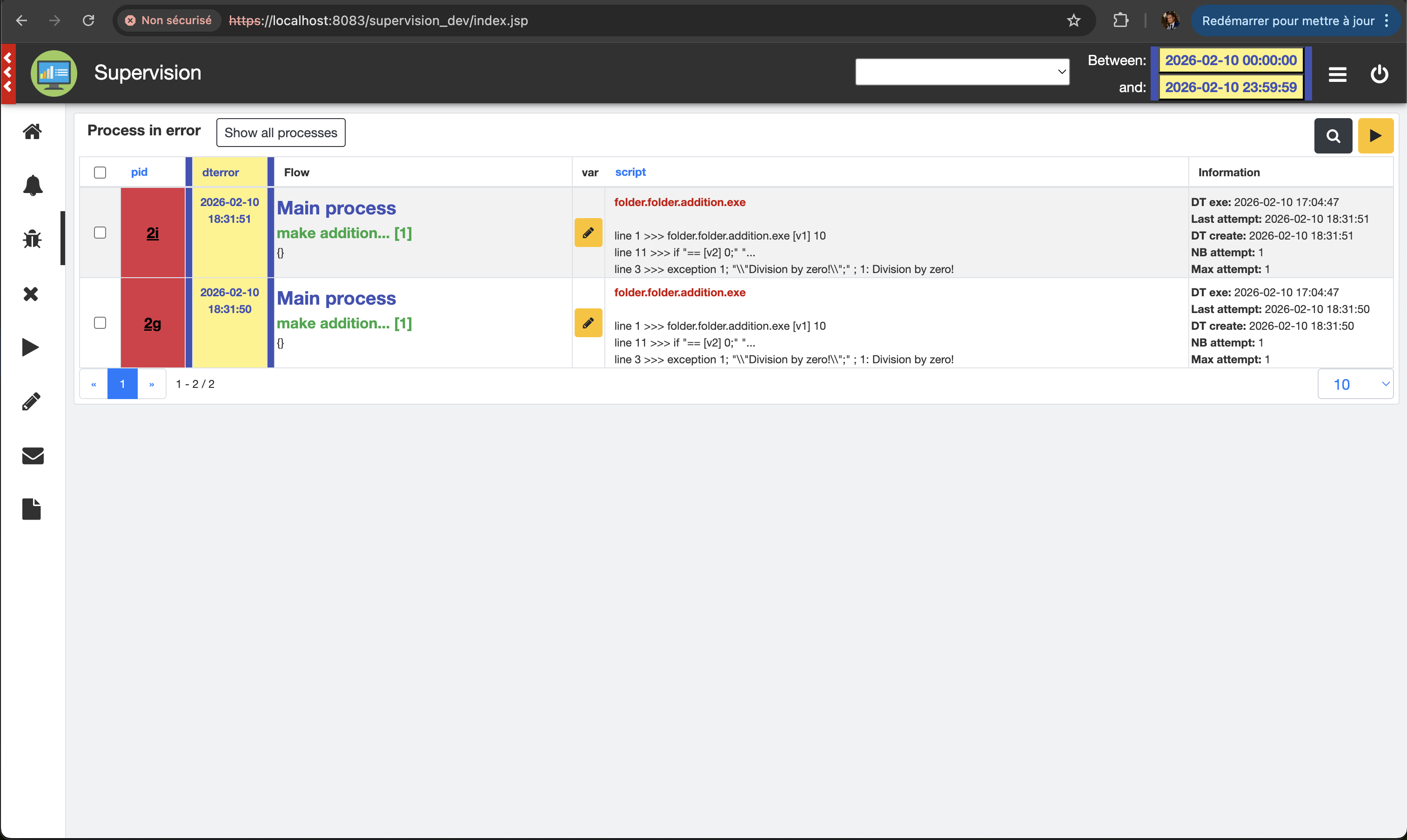 Connect to the application: https://localhost:8083/supervision_dev, and open the process in error page (menu on the left)